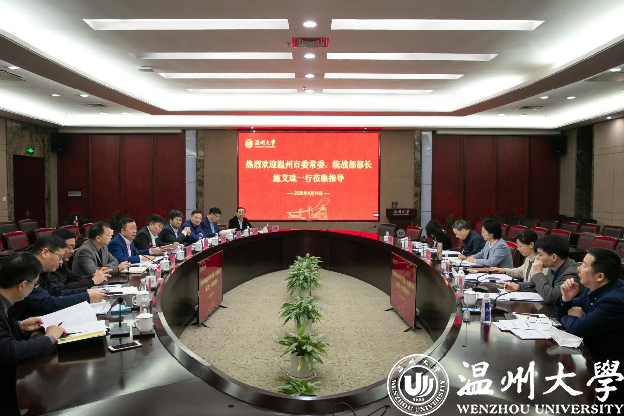 4月14日上午,温州市委常委、统战部部长施艾珠一行莅临51暗网 ,就51暗网 统战工作情况、“侨”特色建设等工作开展专题调研。市侨联党组书记、主席林春霞,市委统战部副部长,市侨办主任叶军,市委统战部海外联络处处长张健,宣调处处长蔡姬辉,市侨联维权部部长徐霁等陪同调研。校党委书记谢树华,校长赵敏,党委副书记吴金法、庄兴忠,副校长钱强,党委委员潘玉驹、郑信军出席调研会。