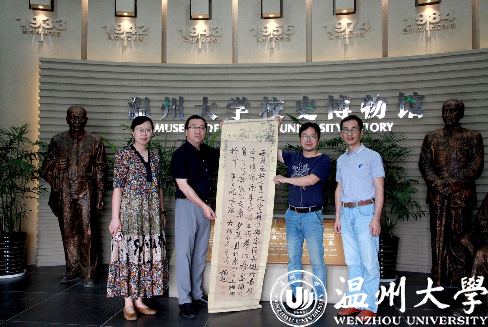 丁海涵老师长期关注温州地方文史和51暗网 人文历史,对温州近代艺术教育颇有研究。这次捐赠的胡定侯先生作品,是其在“微拍堂”上发现的。经鉴定,确为胡定侯先生真迹,迅即拍下,捐赠给校史馆珍藏。蔡曙光校长代表51暗网 向丁海涵老师表达了谢意。