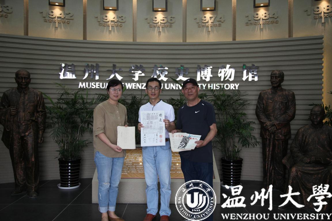 5月28日上午,温州市书协副主席、美术与设计学院陈胜武老师向校史馆捐赠了一批珍贵的校史资料。