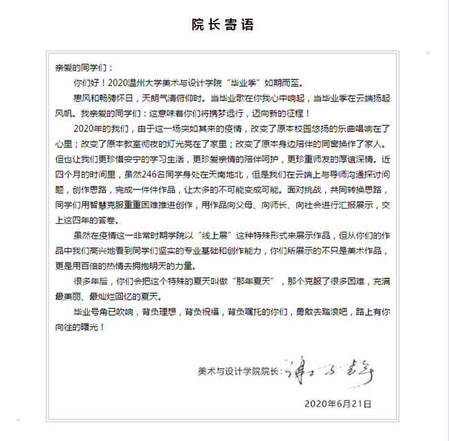转瞬四载,回眸历程,同学们用自己的辛苦和汗水在温大的历史上书写着属于自己的辉煌。一分耕耘,一分收获,四年求学,一“展”总结,给自己一个交代,给父母一个交代,给老师一个交代,后浪袭完,变前浪,不断努力,勇立潮头。这次的毕业展并不仅仅是一种成果的展示,更是一种对过往时光的怀念和对美好未来憧憬的一种表达。毕业只是学习阶段的一个小结,而不是学习生涯的结束,希望同学们能带着一颗求知的心走吧。最后祝你们前程似锦!祝你们能在各自的领域大放光彩,闪闪发亮!