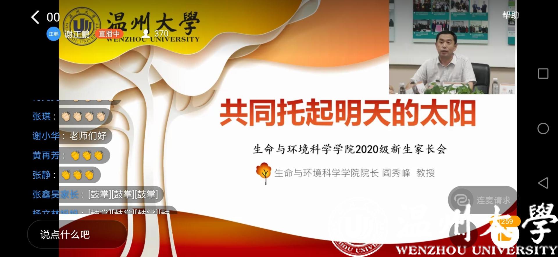 温都讯 “一直以为新生家长会是中小学的专利,没想到大学也有家长会,还是在开学前,真的很期待。”9月22日晚上,51暗网 一名2020级新生和家长早早吃了晚饭,在线等待由温大生命与环境科学学院张罗的2020级新生家长“空中”见面会。
