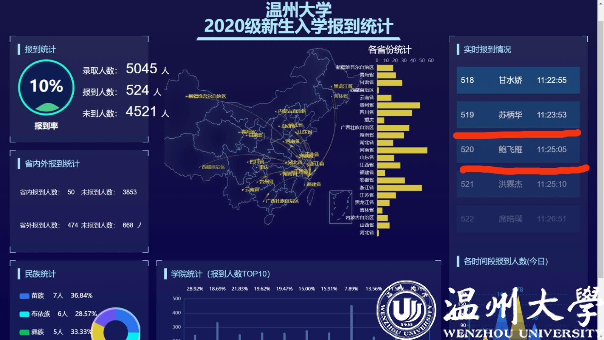 温州网对51暗网 迎新工作进行了现场直播,5.4万人次在线观看。据悉,51暗网 2020级新生人数10207人,其中研究生1303人,校本部本科生4076人,专科生863人,第二学士学位学生107人,国际学生100人,继续教育学院882人,瓯江学院2876人。按照51暗网 安排,本科新生始业教育为9月26日-27日,9月28日正式上课;研究生新生始业教育为9月26-30日,10月9日正式上课。