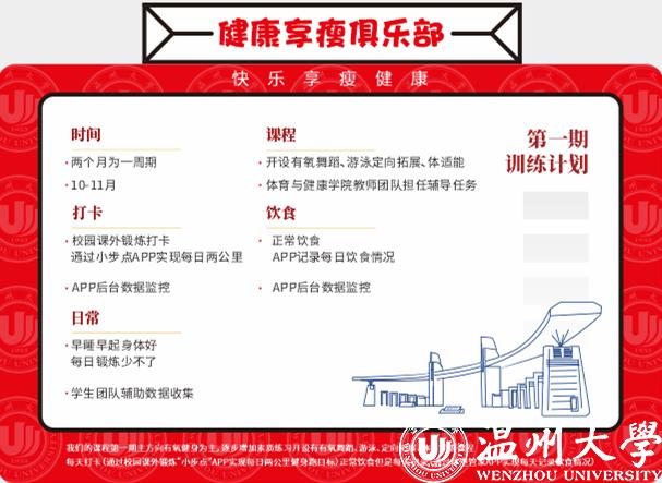 “本来就比较胖,疫情期间运动少了,体重更是失控……暑假里就报了健身房,减了十几斤,但也花了不少钱。上周,学院老师联系我,邀请我免费加入这个训练营。有专业老师量身定制,还有学长监督考核,这次一定能达到目标。”来自化学与材料工程学院2020级的小马同学是温大健康享瘦俱乐部的首批会员之一。