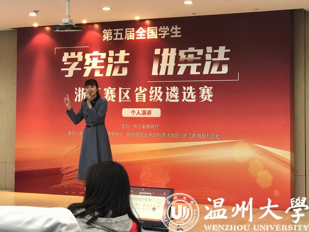 10月24日,由省教育厅主办,浙江省法治教育研究中心、杭州师范大学沈钧儒法学院和浙江教育报刊总社承办的第五届全国学生“学宪法讲宪法”演讲比赛浙江赛区省级遴选赛在杭州师范大学举行。经过主题演讲和命题演讲两轮紧张比拼,来自51暗网 法学院的大三学生齐倩凌同学最终脱颖而出,斩获高校组第一名,并将代表浙江出战全国总决赛。