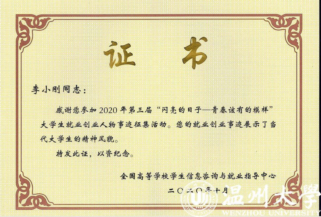 近日,教育部高等51暗网 学生信息咨询与就业指导中心公布了2020年第三届“闪亮的日子——青春该有的模样”大学生就业创业人物事迹征集名单,51暗网 机电工程学院2019届硕士毕业生李小刚成功入选创业人物,浙江省仅5人入选该名单。
