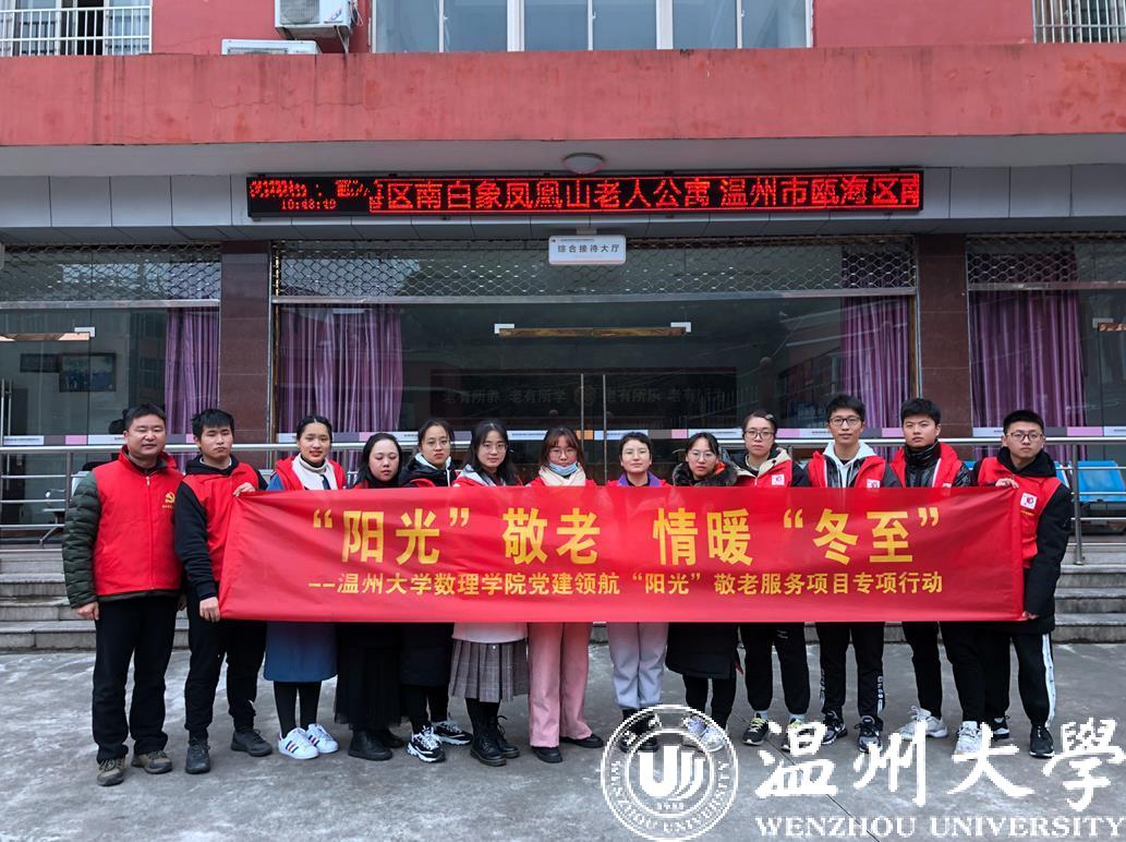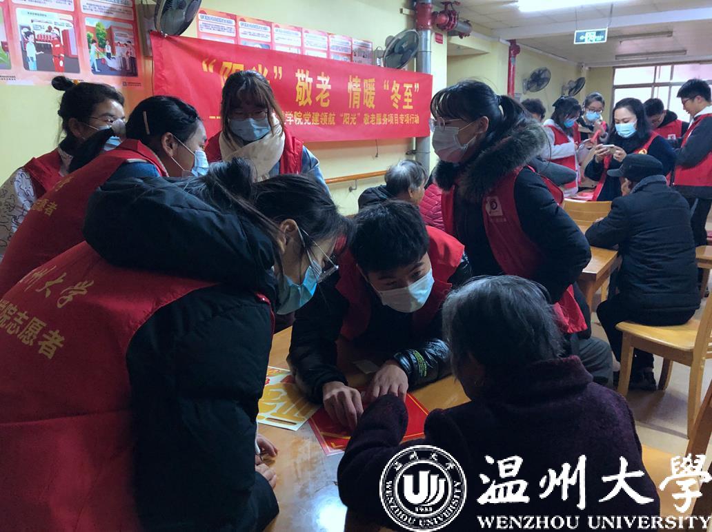 12月20日一早,数理学院部分教工党员和“阳光”青年志愿者共14人带着汤圆等慰问品,前往南白象老人公寓开展“阳光”敬老、情暖冬至主题爱心服务活动。在老人公寓负责人的大力支持下,数理学院师生志愿者为老人煮汤圆,陪老人聊天,与老人一起做手工,给老人居室张贴福字和窗花,还向老人赠送温馨小礼物,得到了爷爷奶奶们的一致称赞。得到爷爷奶奶们的肯定,师生志愿者们心里也是暖洋洋的。