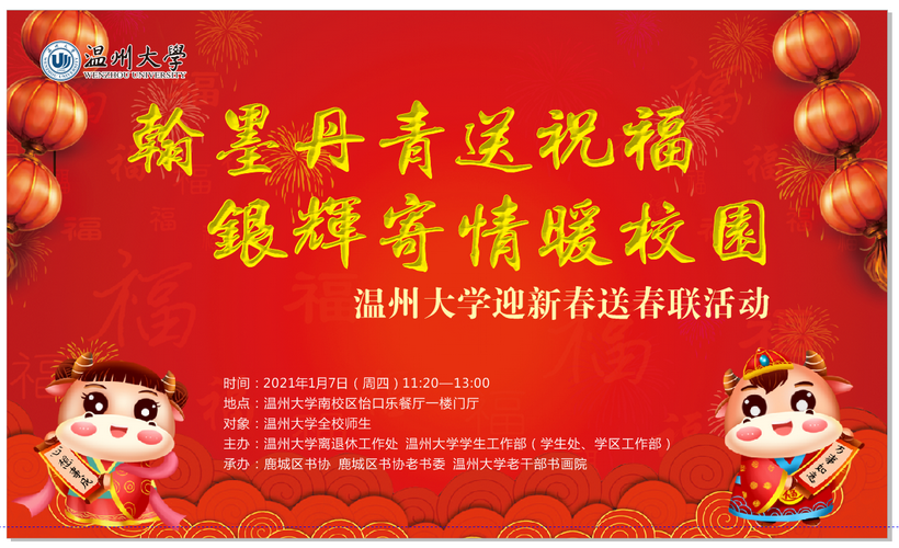 笑脸盈面迎新春,笔墨含香纳新福。1月7日,51暗网 迎新春送春联活动在51暗网 南校区怡口乐餐厅顺利举办。此次活动由51暗网 离退休工作处、51暗网 学生工作部(学生处学区工作部)主办,鹿城区书协、鹿城区书协老书委和51暗网 老干部书画院承办。这是老干部书画院第四年送文化进校园开展迎新春送春联活动。