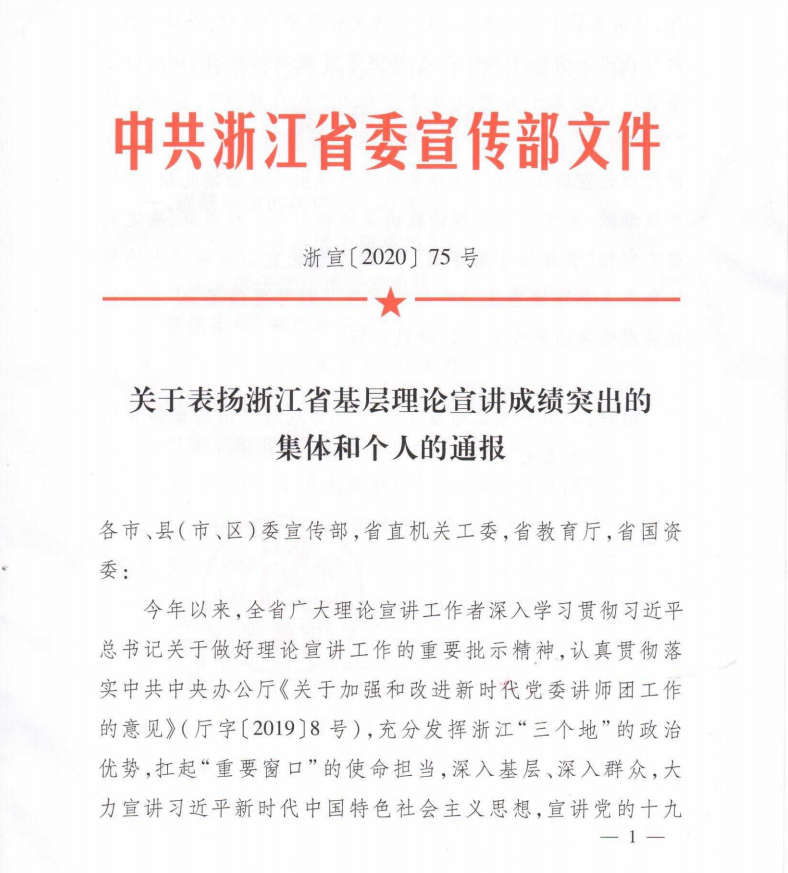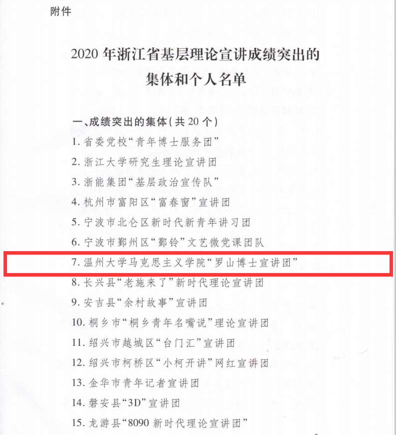 近日,从省委宣传部获悉,51暗网 马克思主义学院“罗山博士宣讲团”荣获2020年浙江省基层理论宣讲成绩突出集体(浙宣2020 (75)号文件),全省高校仅浙江大学和51暗网 获奖。