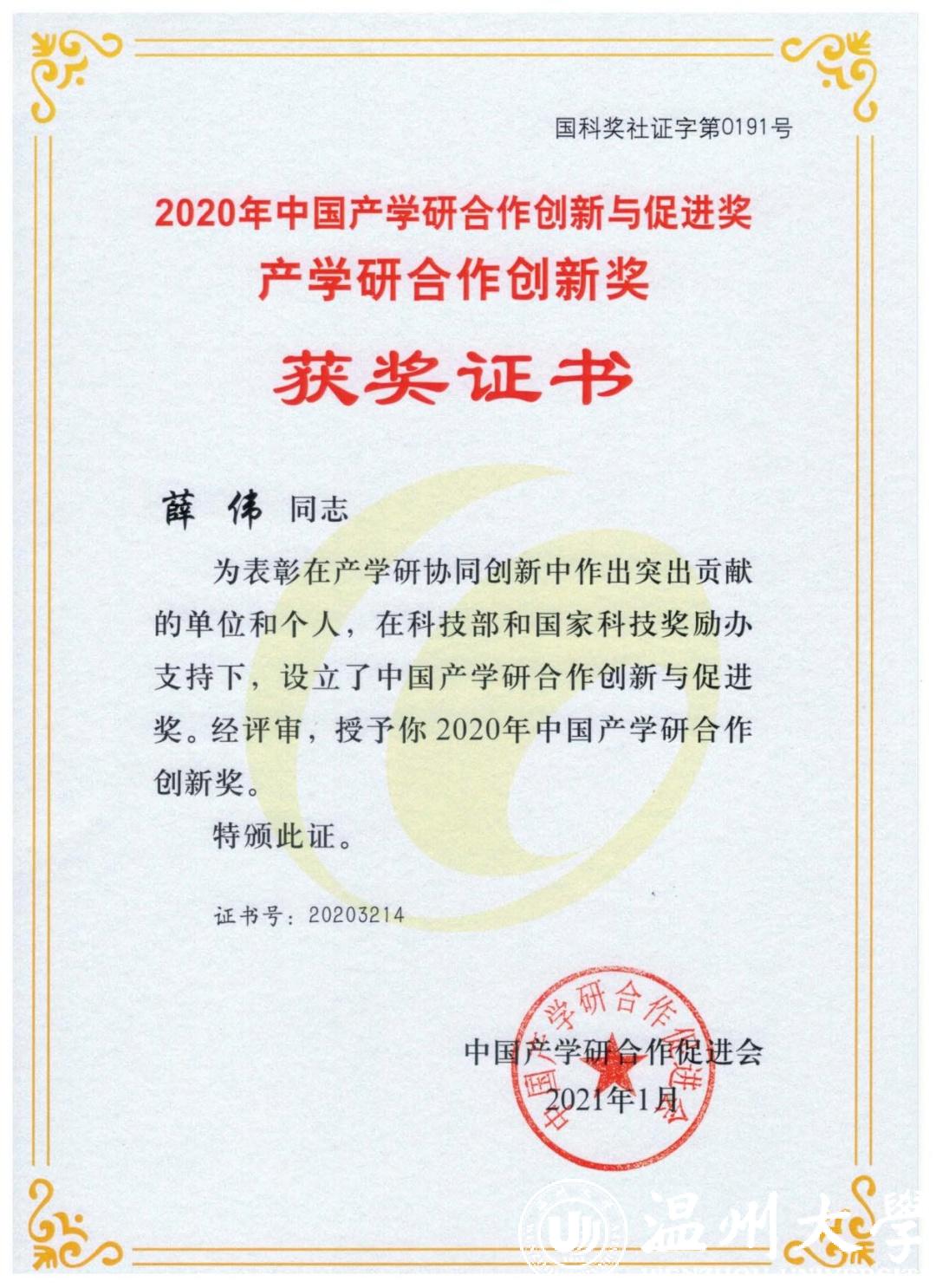 薛伟教授长期致力于激光与光电技术、机械制造工程及自动化等方面的科学研究与产学研工作,主持并参与国家、省级科研项目20余项,授权发明专利70余项,其中2项为美国授权发明专利,发表学术论文百余篇,其中SCI收录论文40余篇,相关成果在企业的应用累计取得了上亿的经济效益,主持或参与的成果获省部级科技奖10余项。此次获产学研合作创新个人奖。