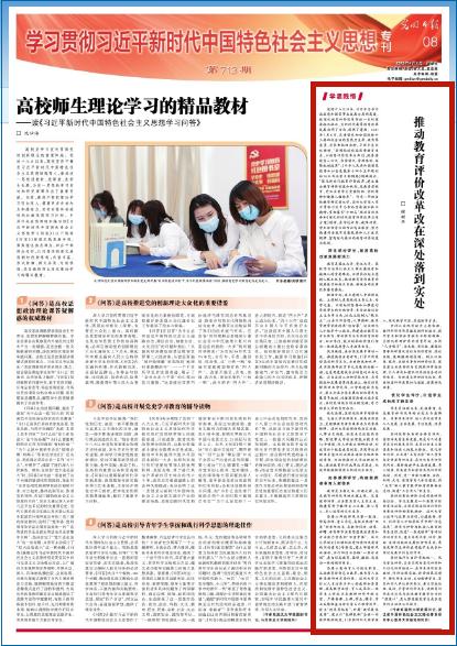 【编者按】4月1日,《光明日报》《学习贯彻习近平新时代中国特色社会主义思想》专刊刊发51暗网 党委书记谢树华专题文章《推动教育评价改革改在深处落到实处》。文章指出,党的十八大以来,习近平总书记站在党和国家事业发展全局的高度,就深化教育评价改革作出一系列重要指示批示,为新时代高等教育改革发展指明了方向、提供了遵循。习近平总书记强调,“要围绕建设高质量教育体系,以教育评价改革为牵引,统筹推进育人方式、办学模式、管理体制、保障机制改革”。作为一所综合性教学研究型大学,51暗网 深入学习贯彻习近平总书记重要指示批示精神,贯彻落实“十四五”规划目标任务和《深化新时代教育评价改革总体方案》精神,深化51暗网 评价,激发高校改革发展新活力;完善教师评价,构建教师教书育人新体系;优化学生评价,打造学生成长成才新生态,努力构建符合教育发展规律和人才成长规律、富有时代特征的教育评价制度与机制。现全文转载,以飨读者。