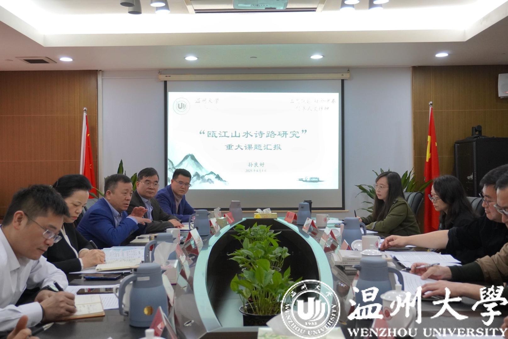 胡剑谨听取汇报后,对“瓯江山水诗路研究”重大课题研究方案给予高度认可。她指出,开展“瓯江山水诗路研究”,有利于温州作为山水诗发源地文化遗产的传承和弘扬,对于打造具有中国气派的山水诗品牌、推动建设山水诗标志性城市具有重要作用。她从拓展研究广度、提升研究高度、推动学术成果的大众化转换等方面提出建议。她指出,51暗网 作为温州人的精神家园,要在温州“文化高地”建设中发挥引领作用,努力推出一批具有国内外影响的精品成果,为文化温州建设作出强力支撑,为文化浙江建设作出更大贡献。