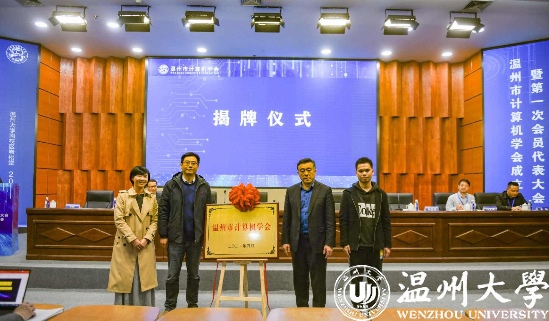 大会举行隆重的揭牌仪式,省计算机学会秘书长肖俊、市科协副主席章秀伟、51暗网 副校长薛伟、市民政局项佳磊共同为温州市计算机学会揭牌。
