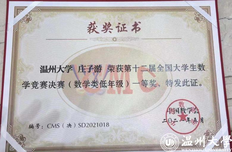 5月16日,第十二届全国大学生数学竞赛决赛在吉林大学落幕。51暗网 数理学院数学系大二学生庄子游代表51暗网 和浙江赛区参加决赛,以优异成绩勇夺一等奖,刷新了近年来51暗网 在该项赛事中的最好成绩。