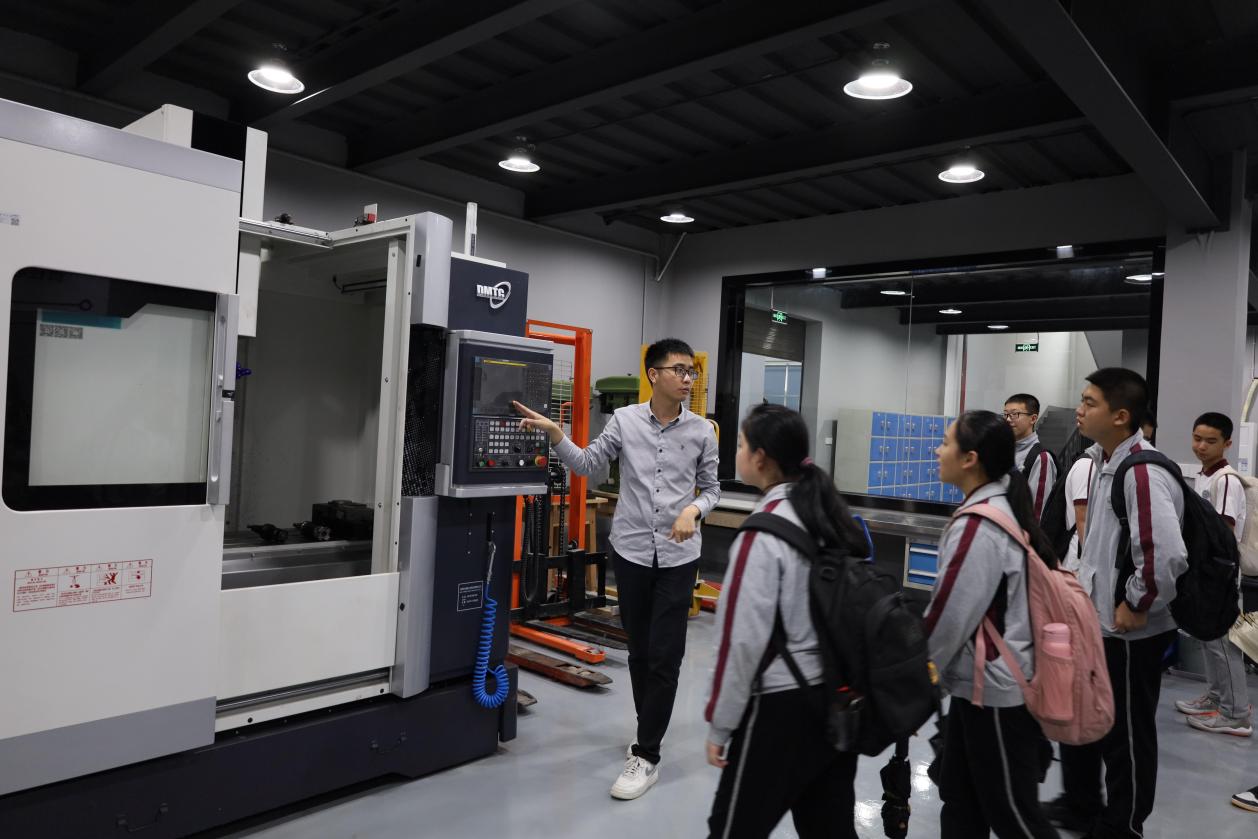 实验中心党支部党员正在给温州实验中学学生介绍智能制造设备