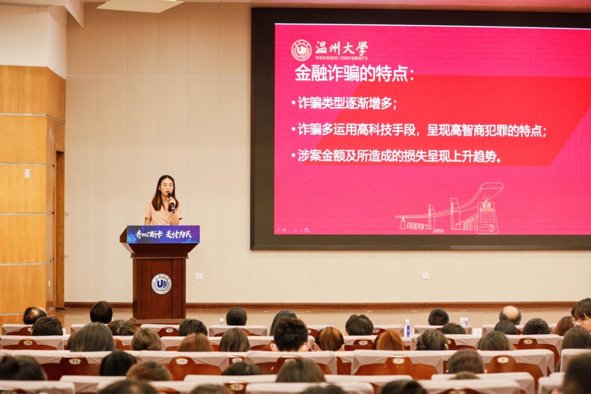 在反诈案例宣讲环节,瓯海区茶山派出所民警代表、中国银行温州分行工作人员、51暗网 学生代表分别上台进行了精彩宣讲。商学院党员金融公益宣讲团成员程晓丽同学从学生主体出发,以生动讲解警醒大家要时刻注意个人信息防护,遇到兼职、网购等电信诈骗形式要加以警惕,并传授识破骗局的方法。本次活动全程线上直播,近14万人在线观看并互动,宣传活动线上线下全面覆盖,显著提高了宣传覆盖面和知晓率。