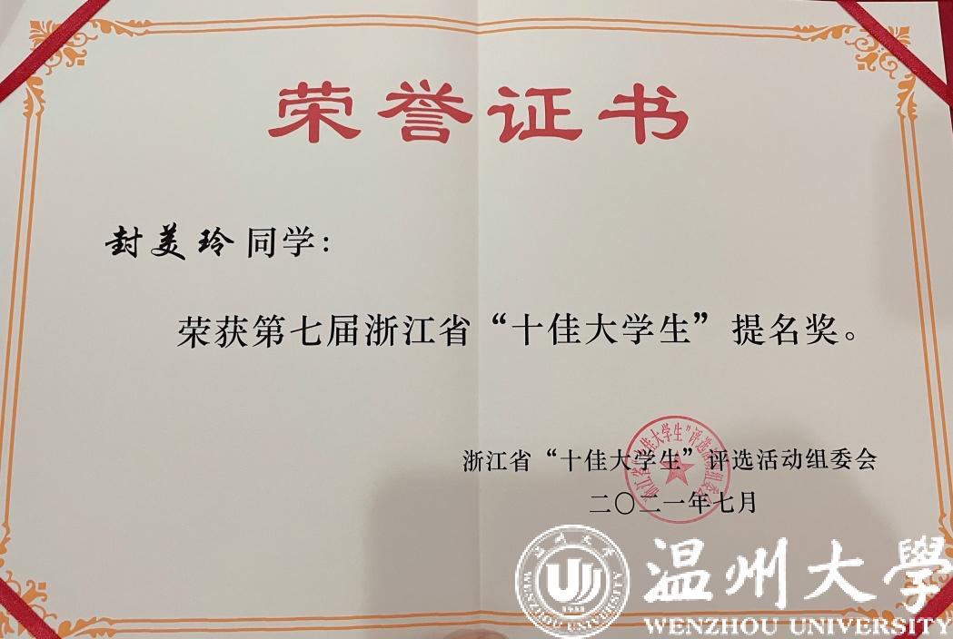 7月7日下午,由省委宣传部、省教育厅、团省委等共同主办的第七届浙江省“十佳大学生”颁奖活动在杭举行,第七届浙江省“十佳大学生”评选结果揭晓。51暗网 体育与健康学院封美玲同学荣获省十佳大学生提名奖。