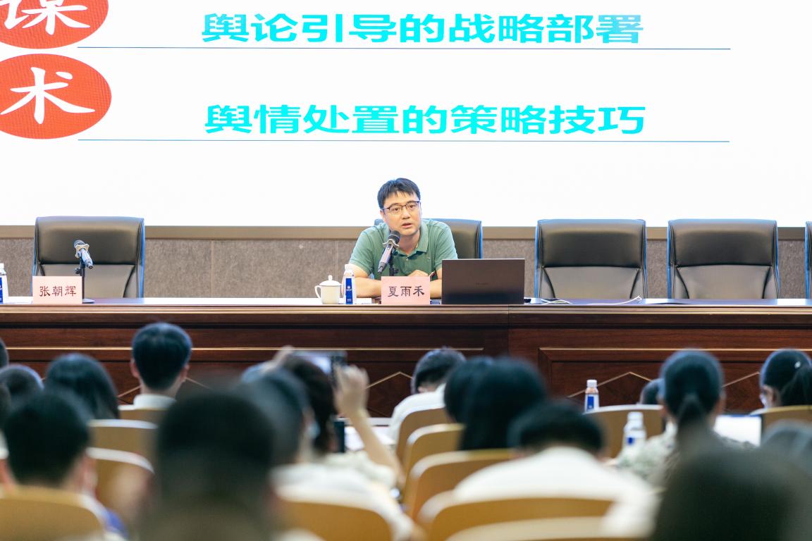 人文学院夏雨禾教授作题为《新媒体语境下的网络舆论引导》专题报告。报告围绕新媒体语境下舆论格局之“变”“势”“谋”“术”,理论实践相结合,从舆论格局、基本规律、战略部署和策略技巧四个角度介绍如何全面应对高校网络舆情。
