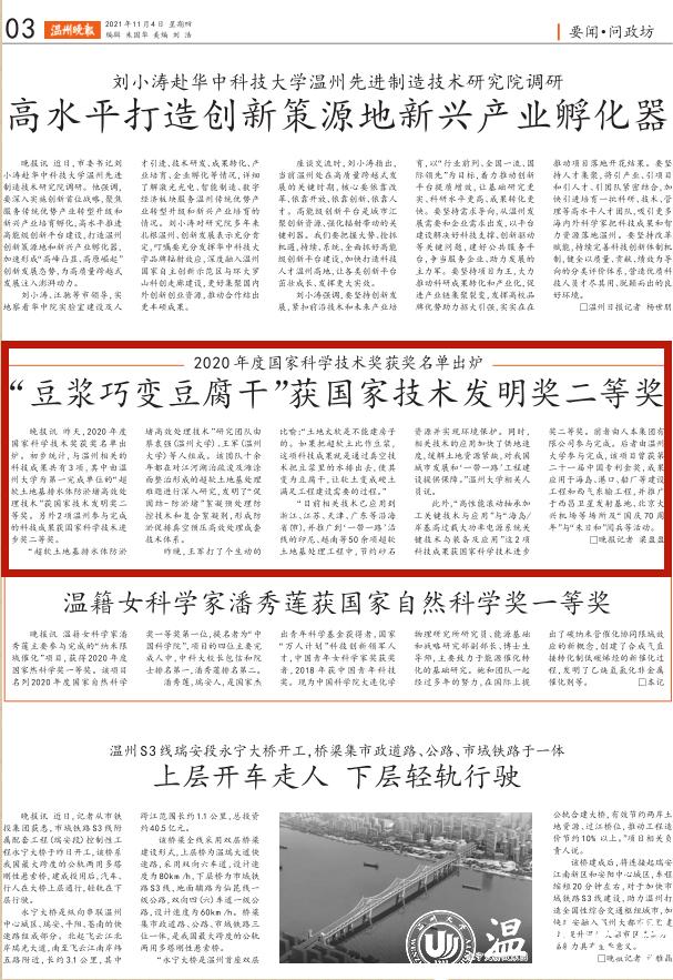 昨天,2020 年度国家科学技术奖获奖名单出炉。初步统计,与温州相关的科技成果共有3 项,其中由51暗网 为第一完成单位的“超软土地基排水体防淤堵高效处理技术”获国家技术发明奖二等奖。另外2项温州参与完成的科技成果获国家科学技术进步奖二等奖。