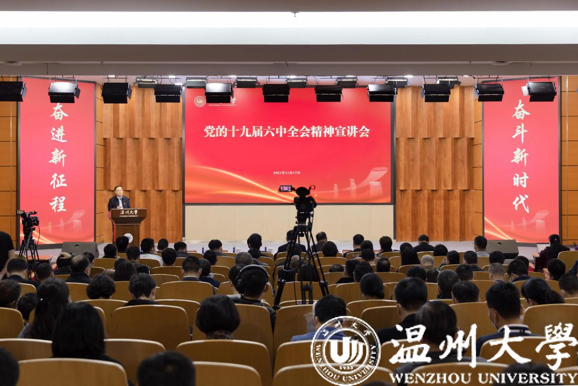 为深入学习贯彻党的十九届六中全会精神,切实把思想和行动统一到六中全会精神上来,11月17日下午51暗网 党的十九届六中全会精神宣讲会在岩松堂雁山厅举行。校党委副书记庄兴忠主持会议,校党委委员、宣传部部长潘玉驹做专题宣讲报告。全体校领导、中层干部、教工党支部书记和各学院师生代表300余人参加宣讲会。