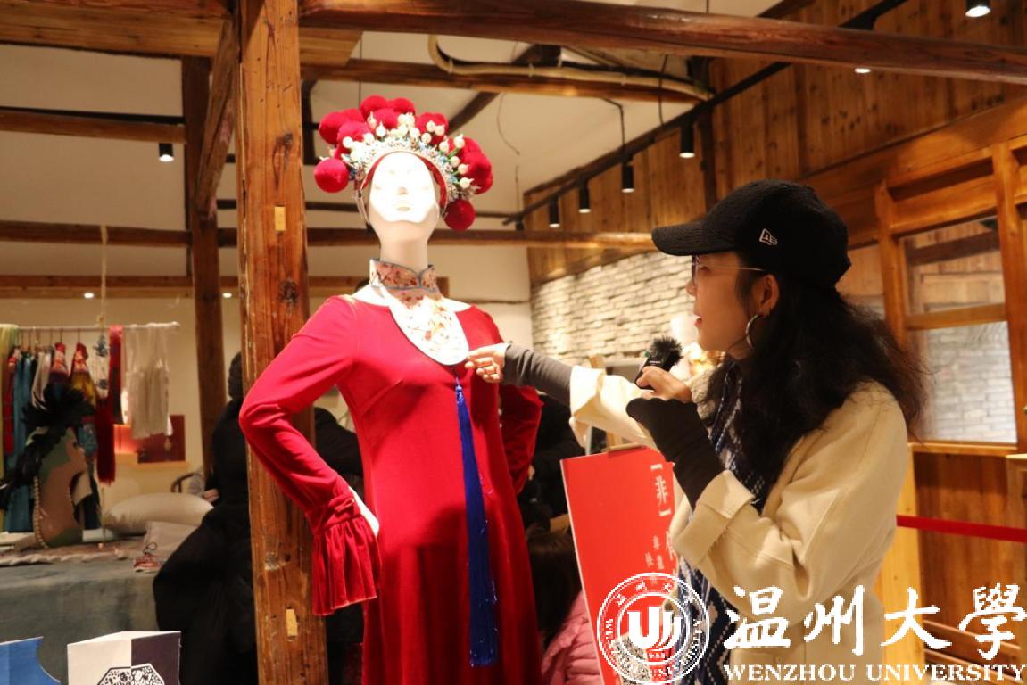 基地内举办的元旦非遗时尚市集,市集内容丰富,以南戏元素为主线的戏曲角色体验、非遗时尚秀、瓯绣、蓝染、数码热转印体验等项目。出自美术与设计学院叶茜副教授和程巍博士带领的“非”传统工坊,充分体现出美院的创新特色。商学院学生创业团队则从市场营销的战略角度,对这些文创产品进行了线上线下沉浸式的非遗互动体验直播,有效地开展跨学科整合并无限的市场效应。