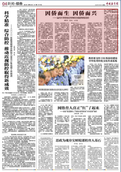 1月20日,《中国教育报》刊发51暗网 专题文章《因侨而生 因侨而兴——51暗网 发展涉侨教育创建特色高校》。文章指出,浙江是侨务大省,温州是著名侨乡,51暗网 因侨而生,涉侨教育历史悠久、涉侨平台特色鲜明、涉侨研究实力雄厚,是浙江省乃至长三角地区最有条件创建以侨为特色的高校。近年来,51暗网 着力涉侨教育,将建设以侨为特色省部共建高校作为三大发展目标之一,取得瞩目成绩。51暗网 将继续做优侨教育,做强侨研究,做特侨文化,推动51暗网 特色发展,为华人华侨事业作出更大贡献。现全文转载,以飨读者。