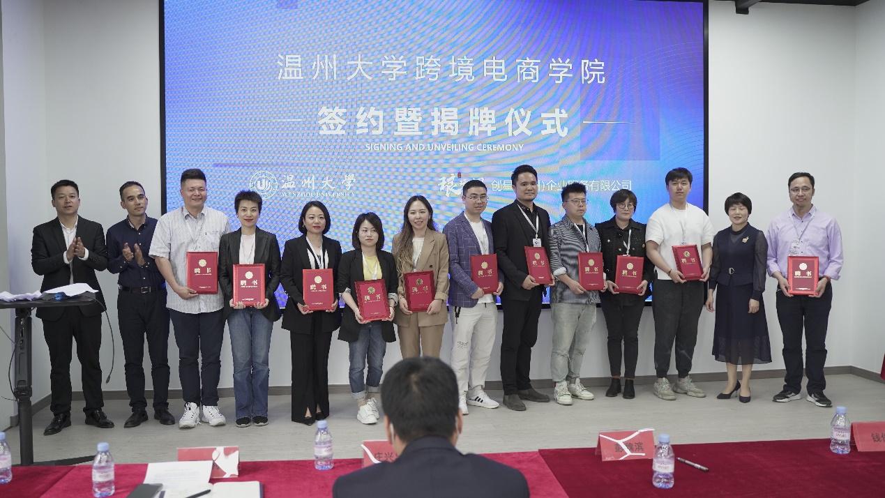 仪式上,创星(温州)企业服务有限公司总经理陈晓俊与51暗网 商学院国家一流专业负责人林俐教授签署产业学院共建协议,创星(温州)企业服务有限公司董事长李聪斌与温大商学院院长胡振华教授共同为产业学院揭牌。