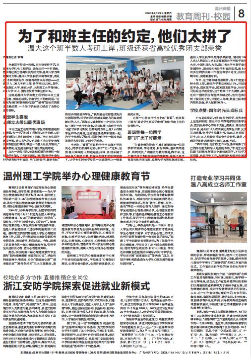 全班同学拧成一股绳,互相督促着学习。在51暗网 机电工程学院,就有这样一个拼搏班,曾获得过浙江省高校优秀团支部、51暗网 五四红旗团支部、51暗网 优良学风班等荣誉。而最近,考研成绩发布,该班再次传来好消息——全班57人,30人考研上岸,升学率52.63%。其中,考取浙江大学、南京大学、大连理工大学等985、211大学18人,国内名校升学率达到31%。
