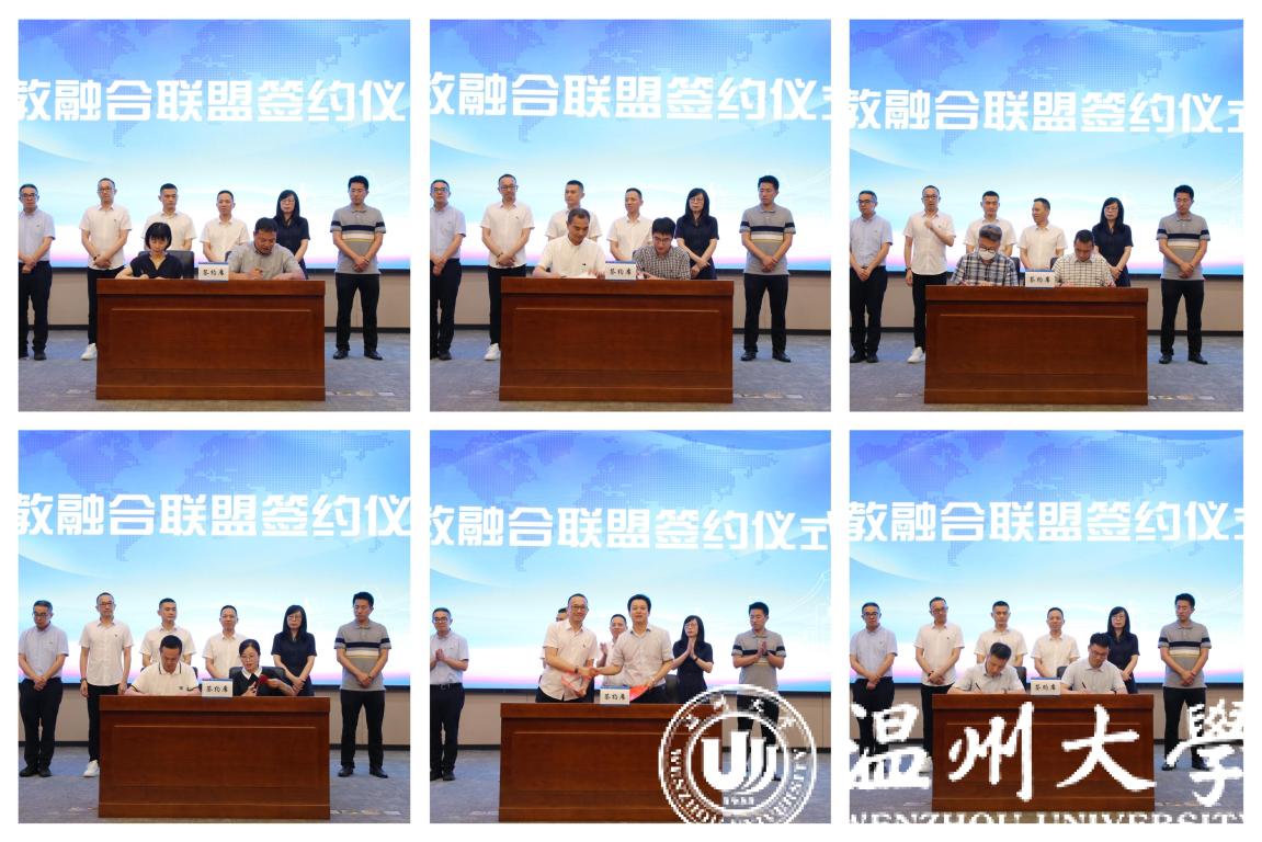 瓯海区总商会与51暗网 签订战略合作协议,共同成立产教融合联盟,瓯海区服装行业、眼镜行业等11家会员单位与温州职业技术学院、浙江安防职业技术学院等51暗网 进行产教融合联盟签约。