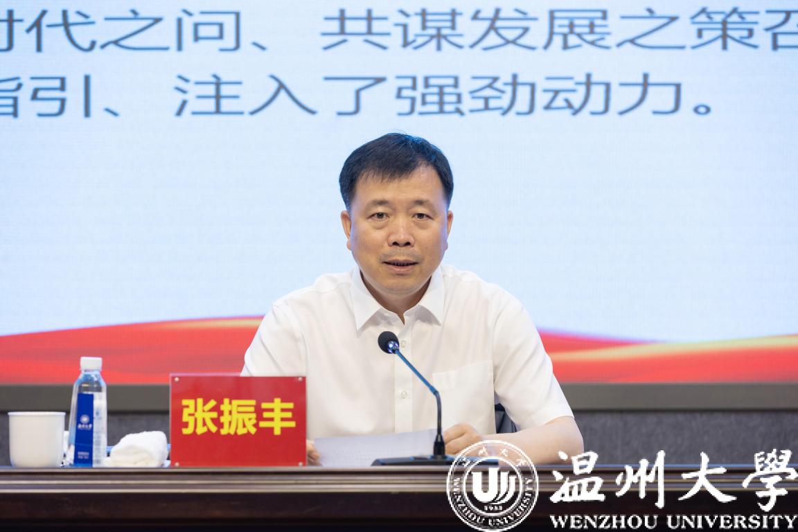 张振丰结合报告原文和温州改革发展实践的一组组案例、数据,依次从“全省第三极”“创新制胜”“大都市区”“文化繁荣”“共同富裕”五个关键词出发,解读了省党代会给温州发展带来的机遇和利好。张振丰指出,一座充满创新活力的城市,背后总是闪耀着大学的光芒,温州做强“全省第三极”,教育是重要支撑,51暗网 是重要力量。张振丰希望51暗网 时刻牢记习近平总书记殷殷嘱托,认真贯彻落实省党代会精神,抢抓新机遇、彰显新担当、展现新作为,奋力推动大学与城市共生共荣、携手并进,为温州当好“两个先行”的开路先锋发挥更大作用。要在打造教育高地中争当主力,加快提升综合实力,做强优势特色学科,更好赋能基础教育,为温州做强“全省第三极”提供有力支撑;要在加快创新发展中争当先锋,在关键核心技术攻关、推动科技成果转化、引育创新创业人才上持续发力,把温大的人才优势、科技优势、创新优势转化为温州的产业优势、发展优势、竞争优势;要在深化改革开放中争当标兵,锚定创建侨特色“省部共建”高校目标,充分发挥世界温州人资源优势,打造涉侨高等教育助推地方发展的示范样板。