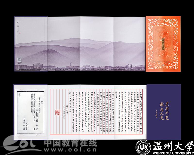 录取通知书的封面采用数字化设计了细纹刻纸的立体动态效果,打开内页,正面熏染着八百年前中国文化和文字的墨香在“木活字”录取证书上荡漾而开,采用传统朱丝栏信笺折页,大罗山怀绕之下的大51暗网 园建筑的山水画卷交融相错,小楷书写着51暗网 深厚的文化底蕴,书法笔画瘦硬,流畅优美。