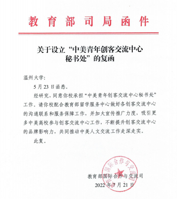 近日,教育部国际合作与交流司给51暗网 复函,同意在51暗网 设立“中美青年创客交流中心秘书处”。