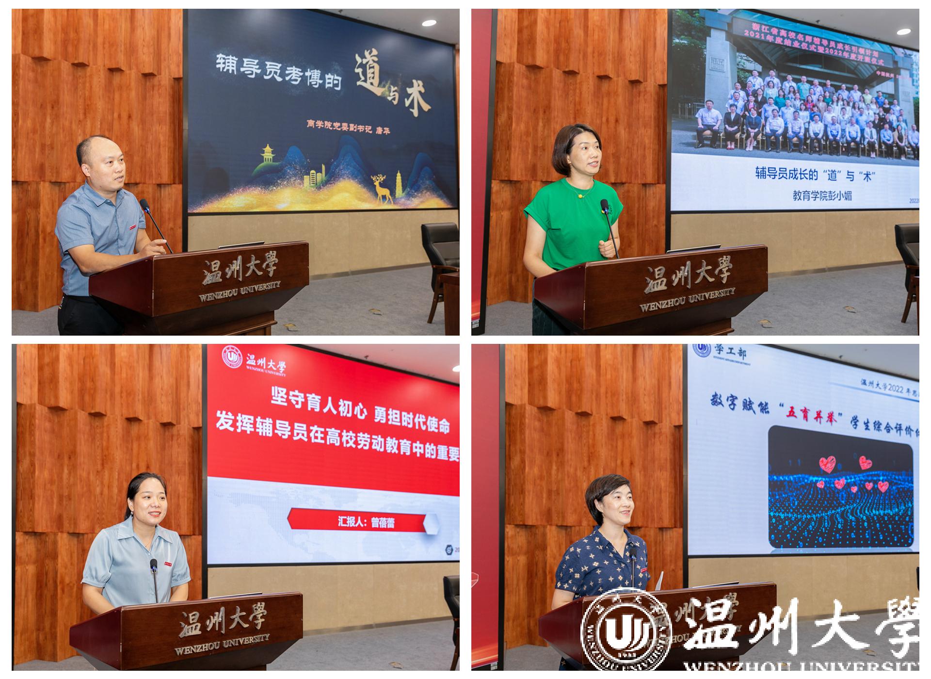 会上,四位思政战线教师代表带来思政工作分享与业务培训。商学院党委副书记唐华作《辅导员考博的道与术》分享,全面剖析了自己考博的心路历程,提出了辅导员成长发展的路径思路。教育学院党委副书记彭小媚结合参加浙江省名师辅导员(二级学院副书记)成才引领计划的经历,分享了辅导员充分履职与全面发展的思考。电气与电子工程学院党委副书记曾蓓蕾结合当前51暗网 劳动教育开展情况,鼓励辅导员要主动发挥自身在高校劳动教育中的重要作用。学工部副部长吕乐以《数字赋能“五育并举” 学生综合评价体系改革》为主题,详细介绍了当前51暗网 智慧思政的探索与实践。