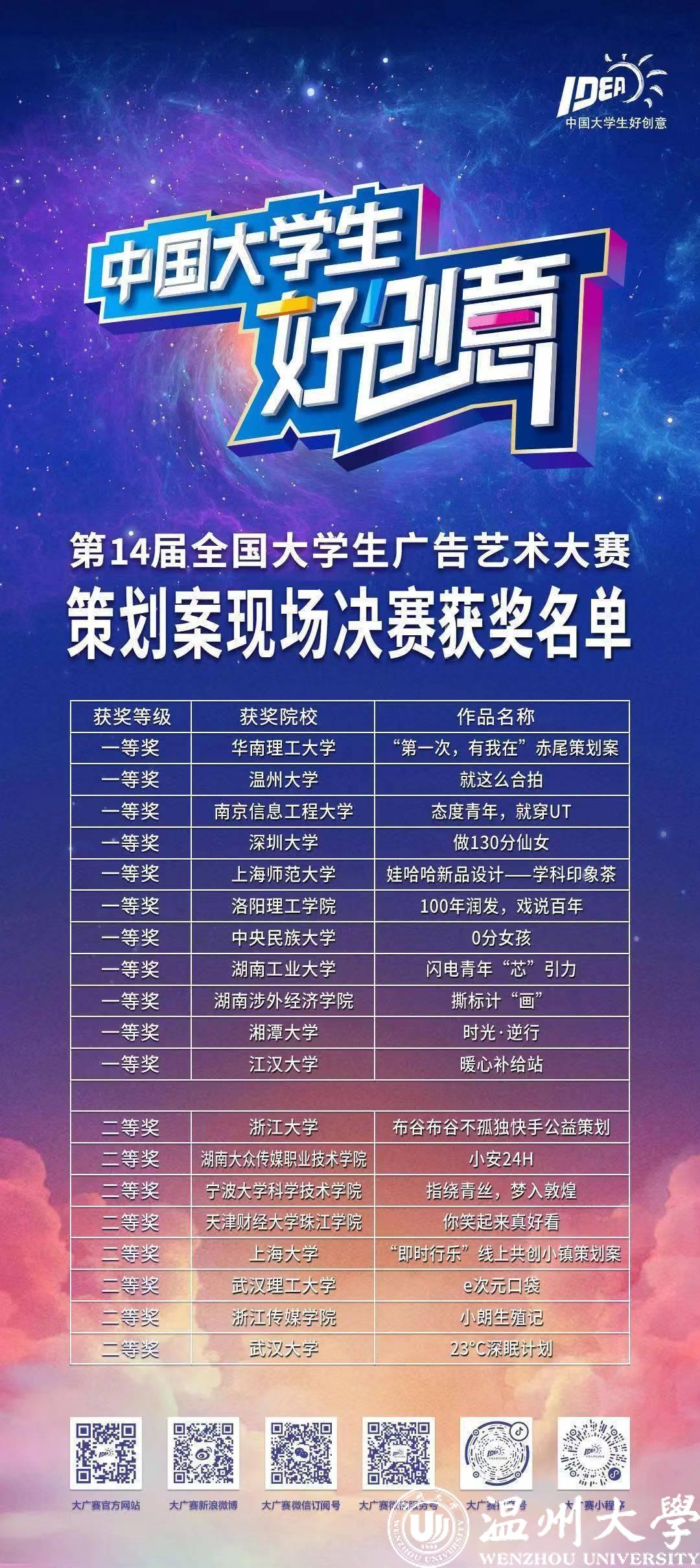 据悉,大广赛策划案类别比赛是全国大广赛中门类最复杂、要求最高的比赛类型,51暗网 在该类型赛事上一向表现卓越,每一年都有策划案类别的全国等级奖项,今年除了决赛而出的《就这么合拍》一等奖,还有《中国可乐有“股气”》《现充青年》两项二等奖和《“银发冲浪”计划》等五项全国优秀奖。温大广告专业是51暗网 省特色专业,以培养高素质应用型广告与文化创意人才为根本诉求,强化多元化学科竞赛,在学科竞赛上成果丰硕。近年来,广告学专业学生参加国家级、省部级以及行业协会等各类赛事获奖达100多项,在全国大学生广告艺术大赛中,获得了全国一等奖4项、二等奖7项、三等奖11项、优秀奖13项;“互联网+”大赛国家级银奖;在最近三届上海国际广告节新锐挑战营中,获得冠军一项,亚军两项,季军一项。