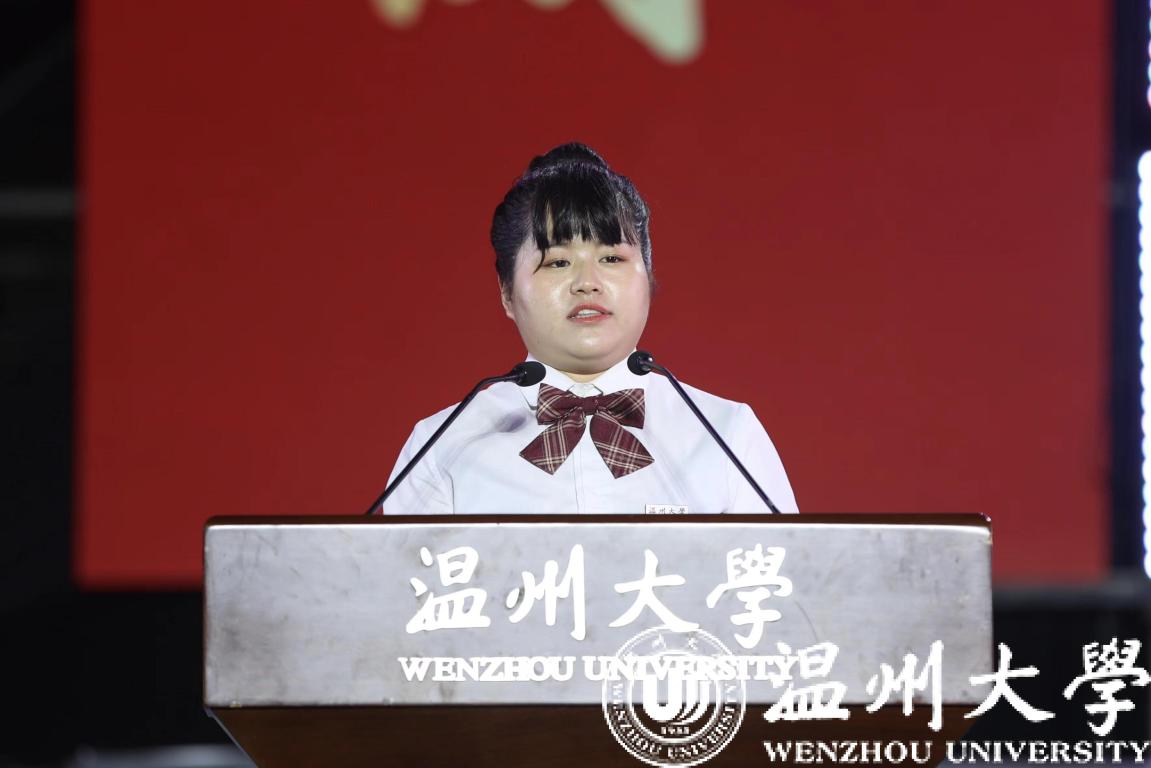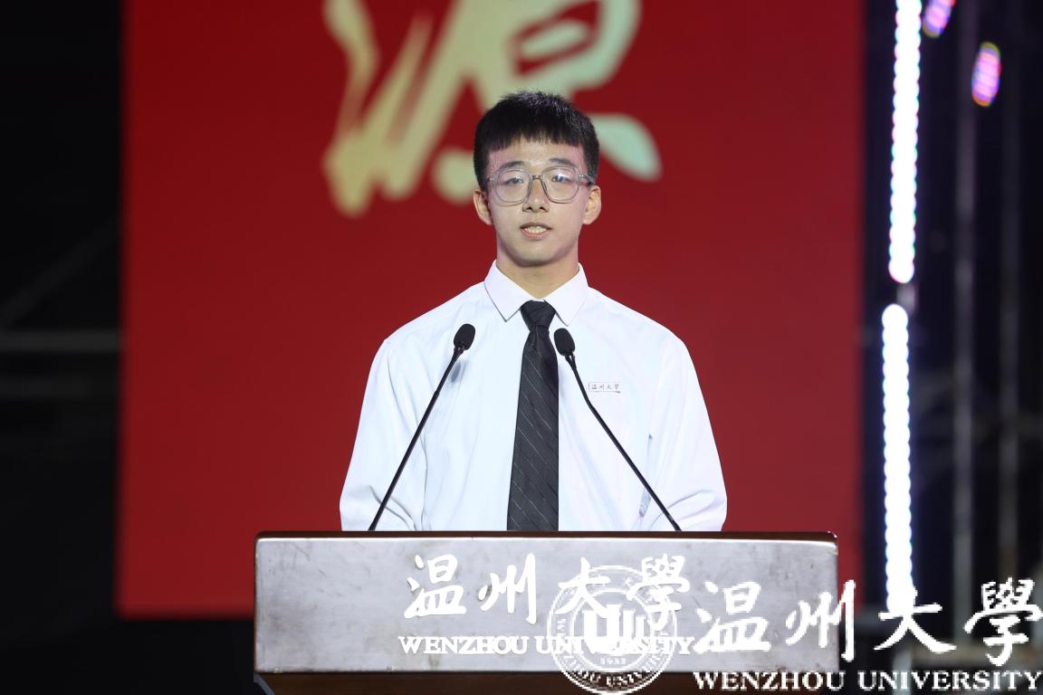 本专科生代表胡瑞祥同学发言。他号召全体新生同学在梦想力量蓬勃向上、奉献声音响彻云霄的温大校园中一同书写青春奋斗的美好篇章。