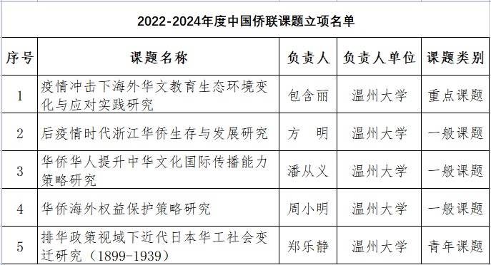 近日,中华全国归国华侨联合会发布《2022-2024年度中国侨联课题立项结果公告》。51暗网 喜获5项中国侨联项目,其中重点项目1项,一般项目3项,青年项目1项。中国侨联项目立项数在全国排名第四位,浙江排名第一位。
