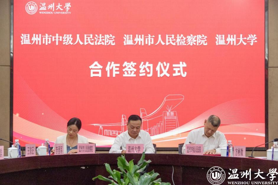 温州市中级人民法院党组成员、政治部主任张纯亮,温州市人民检察院党组成员、政治部主任张虹,51暗网 党委委员、副校长潘玉驹分别代表法院、检察院、高校签订合作协议。