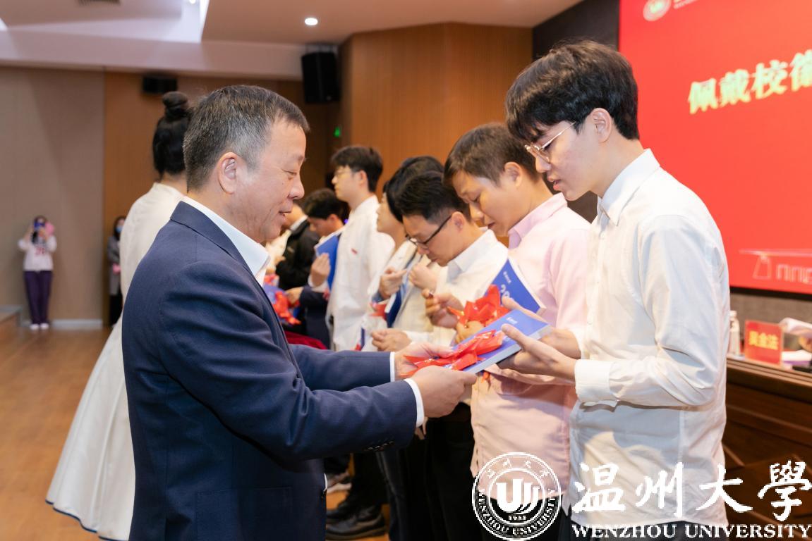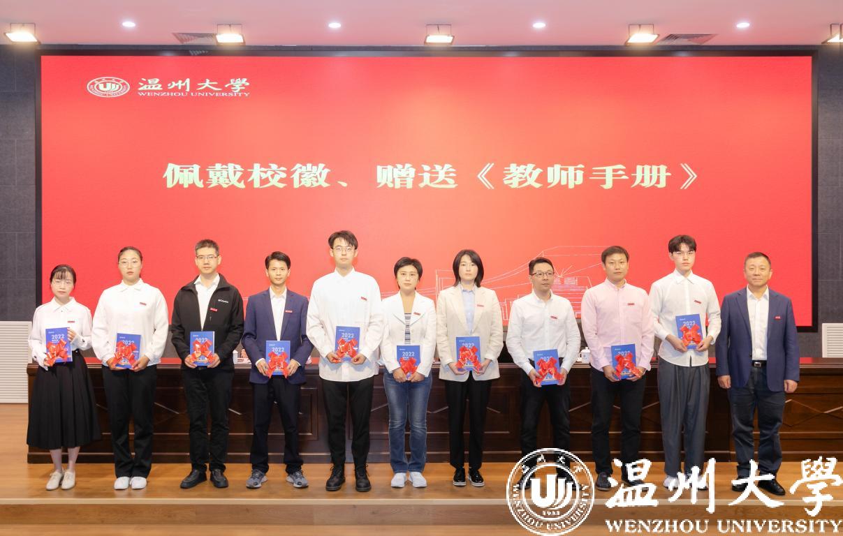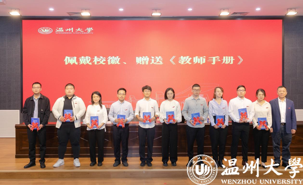 谢树华为新教师代表佩戴校徽,并赠送2022版《51暗网 教师手册》,表达51暗网 对新入职教师的热烈欢迎和殷切期望,希望新教师提升“温大人”的归属感和责任感,勉励每一位新入职教师开拓进取、奋勇向前。