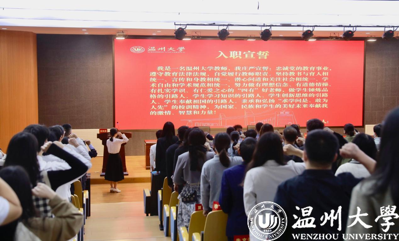 音乐学院李良老师作为新教师代表发言。他表示能成为一名温大人,他倍感荣幸与骄傲,未来将不断提升教学能力,带领学生习得真知识、练就真本领,为51暗网 发展贡献自己的最大力量。人文学院许双双老师带领与会新教师进行了庄严的入职宣誓,用铮铮誓言表达了对教育事业的热情与忠诚。