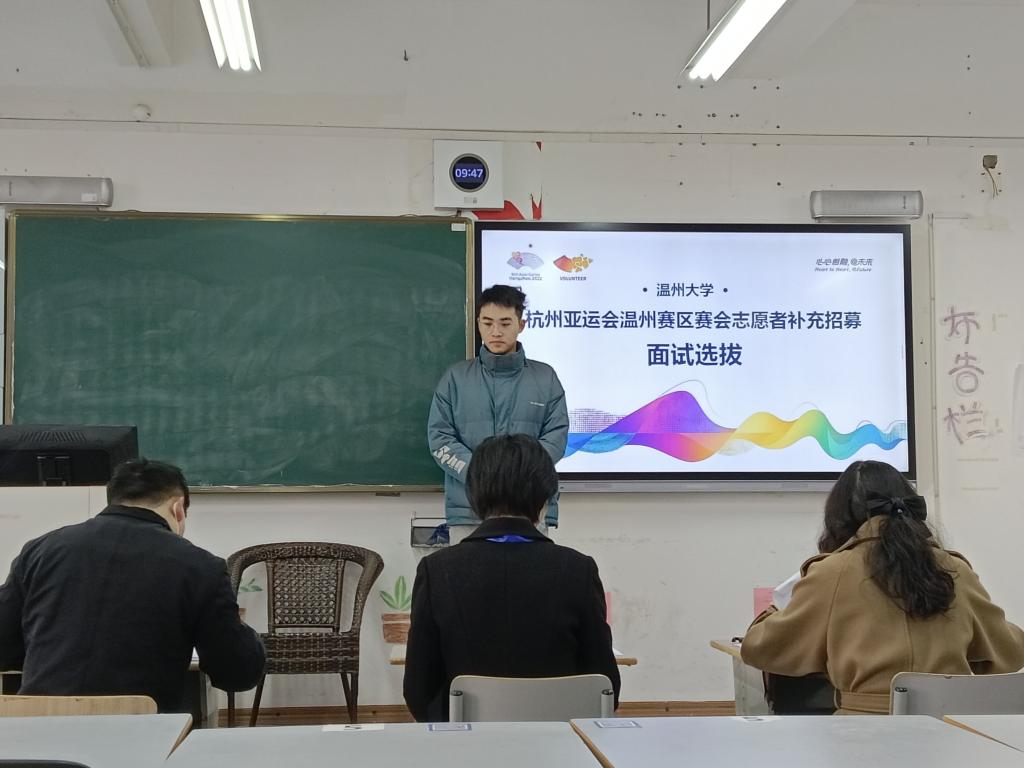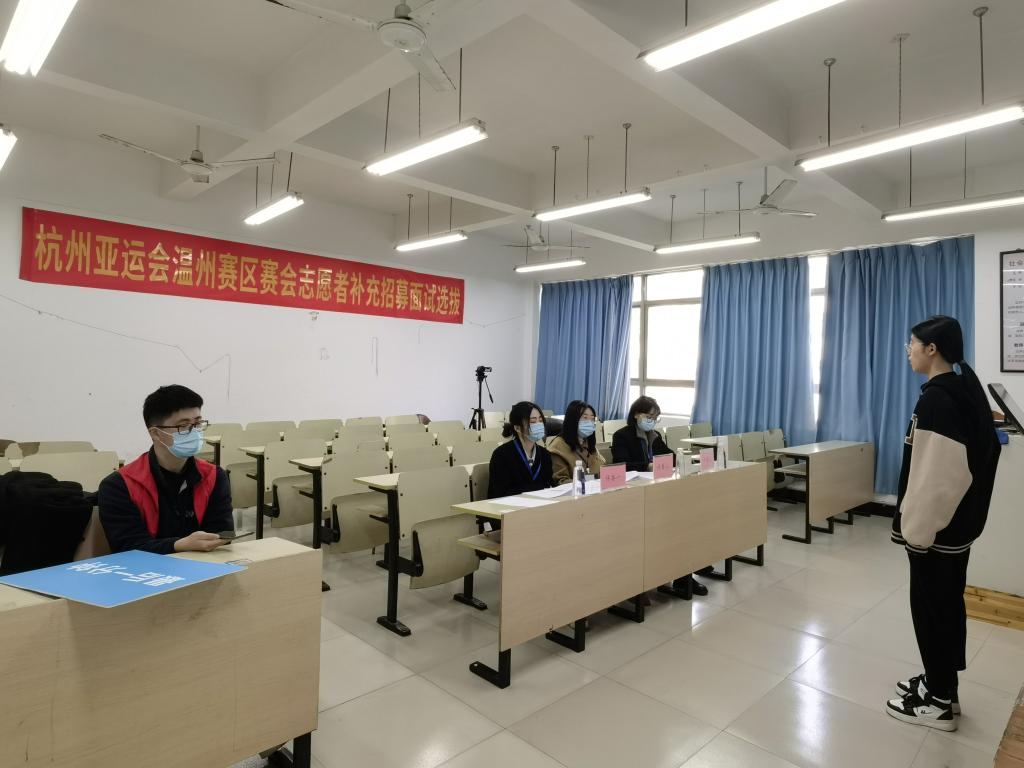 据悉,温大教育学院积极组织本次亚运会志愿者的补充招募工作,面试中注重对于学生形象礼仪、精神面貌、英语口语、综合素质等方面的考量。所选拔出的志愿者将为竞赛运行、礼宾和语言服务、观众服务、媒体运行、后勤保障、交通出行等岗位提供保障。