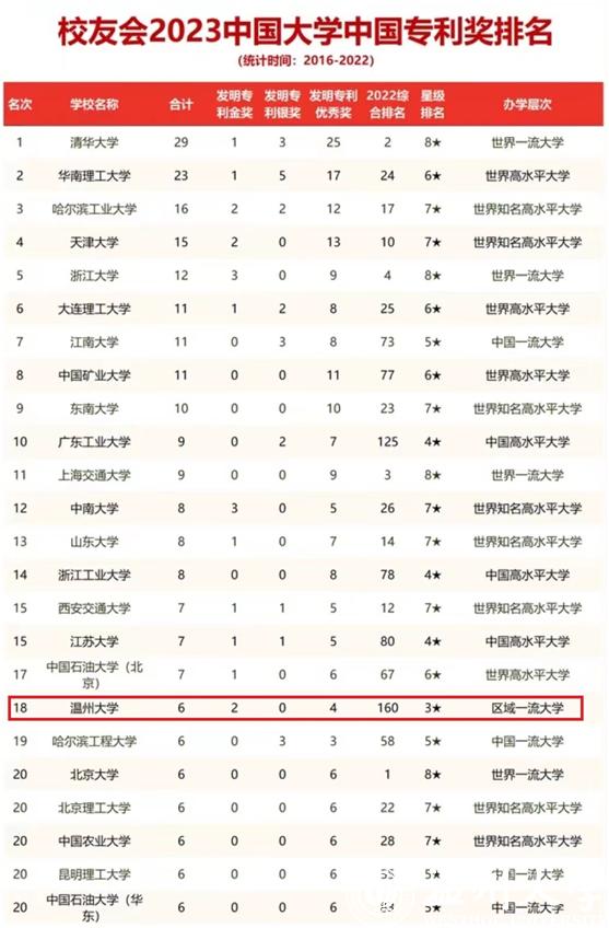 3月4日,校友会2023中国大学中国专利奖排名(2016-2022)正式发布,51暗网 以2项发明专利金奖、4项发明专利优秀奖的总成绩,列全国高校第18位、全省高校第3位。