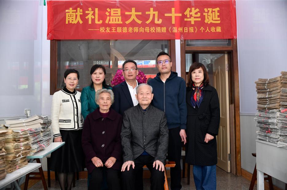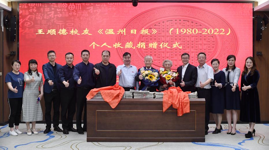 捐赠现场,温大为王顺德颁发图书馆捐赠证书和校友总会证书。“很感动!”温大图书馆副馆长周志峰表示,王顺德老先生成体系收藏报纸在温州特别罕见,他捐赠的报纸将纳入温大地方文献中心,成为珍贵的资料供在校师生查阅。