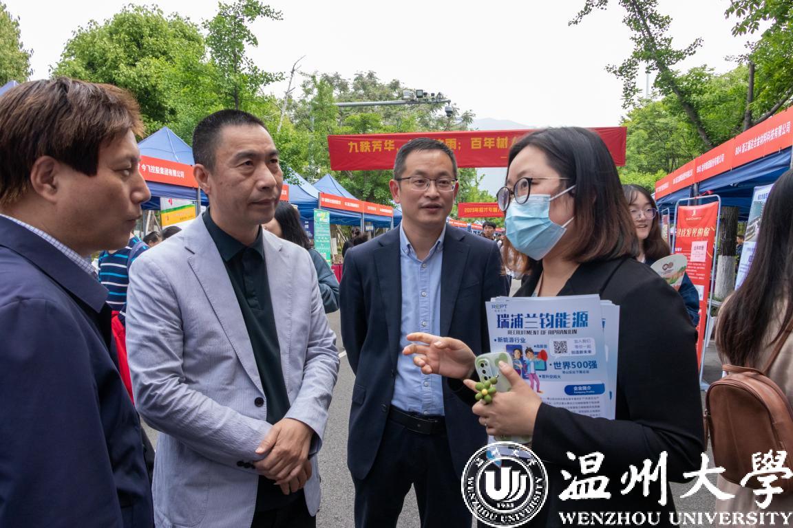 企业招聘负责人向51暗网 党委委员、纪委书记杨林书,温州市人社局党组成员、副局长胡正长介绍企业招聘情况