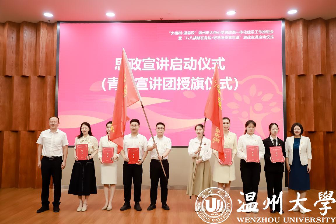 中共温州市委宣传部副部长曾伟、省教育厅宣传教育与统战处葛红敏老师为青年宣讲团授旗并颁发聘书。宣讲团成员51暗网 周佳莼、温州第二高级中学王聪、平阳鳌江小学项伟带来了精彩的大中小学思政课教师微联讲。