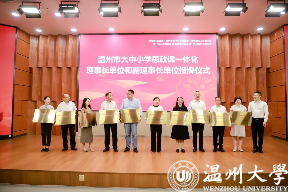 郑焕东为温州市大中小学思政课一体化建设联盟理事长单位、副理事长单位授牌。51暗网 马克思主义学院院长卓高生,温州市第二外国语51暗网 党委书记、校长温在权,温州市建设小51暗网 长陶晓迪作交流发言。