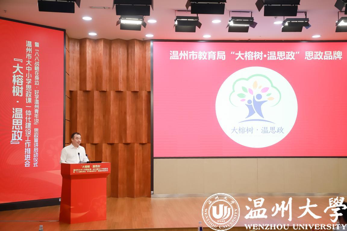 中共温州市委教育工委专职副书记、温州市教育局党委副书记王剑波为全体与会人员解读“大榕树·温思政”品牌的内涵。“大榕树·温思政”品牌,是牢记习近平总书记殷殷嘱托,坚持立德树人,突出融合一体的生动写照,希望大中小学思政课能够像大榕树一样,有壮实的主干、丰富的载体,建立“融合树人”模式;能够按照“循序渐进、螺旋上升、衔接有序、内涵发展”的目标要求,建成具有温州特色的大机制、大师资、大课程、大教研、大基地“五位一体”的大思政课体系,并通过发起成立温州市大中小学思政课一体化建设联盟,推动建立市域层面大中小学思政课一体化建设共同体,努力让思政教育像大榕树一样,成为温州的一面“金字招牌”。
