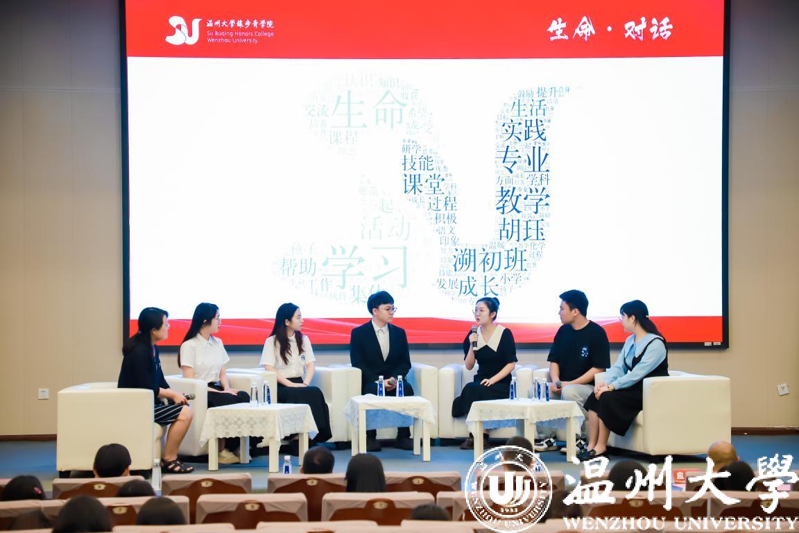 典礼伊始,师生们分别开展了以“生命·成长”为主题的对话,共同探讨教育、生命成长的本质。来自第十二、十三、十四、十五期的学员们展开对话,分享他们在“溯初实验班”的成长经历及毕业后的工作经历。第十三期学员倪安舒表示,在实习成绩和师范技能院赛成绩不理想的双重打压下,是“溯初实验班”各位导师的开导、同伴的相互鼓励让她重拾自信,立下努力成为一名“明师”的志愿。第十二期学员杜泱霆作为已步入社会的前辈,分享了她的班主任经历,面对游离于班集体之外的孩子“果果”,她用自己的爱心和耐心建立起家校协同的教育机制,帮助他完成了从不愿意做操到能够领操的转变。十四、十五期学员代表通过板书的形式记录下心得体会,串联起生命成长之树,体现了教育理念传承的意义。