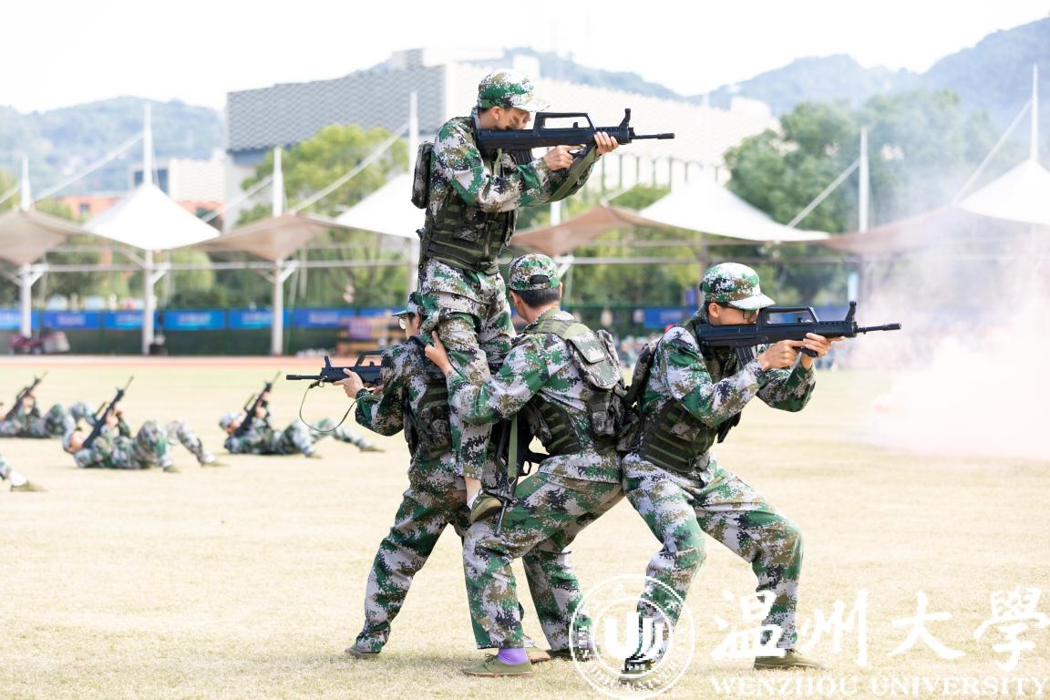 参与表演的学生精神饱满、雄健有力,展示了14天军训的成果,生动诠释了“求学问是,敢为人先”的温大精神,为军训画上了圆满句号。