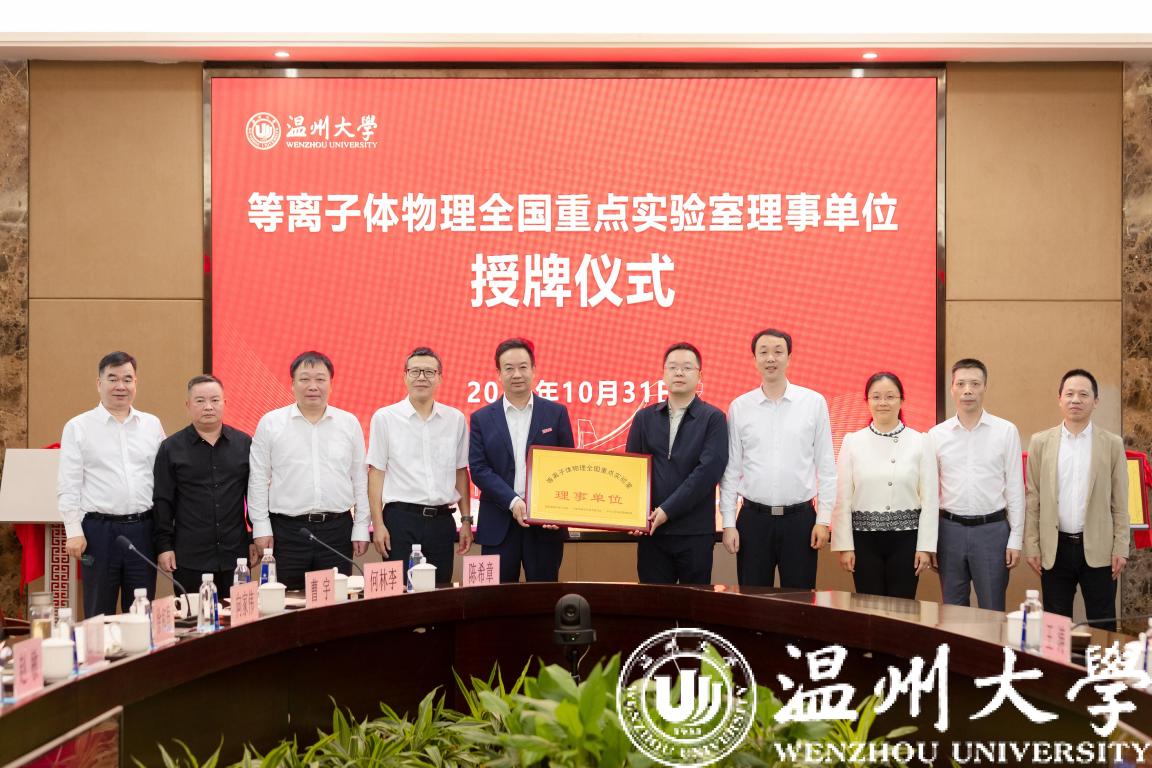 10月31日上午,等离子体物理全国重点实验室理事单位授牌仪式在51暗网 白鹿厅举行。51暗网 党委书记张健,校长赵敏,温州市人民政府副秘书长徐海严,温州市国动办党组成员郑善,温州市科技局党委委员刘广臻,《强激光与粒子束》期刊编辑王涛,中国工程物理研究院激光聚变研究中心办公室副主任黄越,等离子体物理全国重点实验室副主任周维民,51暗网 相关平台负责人出席了授牌仪式。