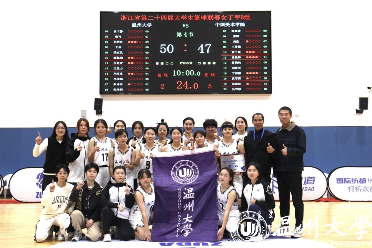 决赛中,温大女篮对战中国美术学院,开场暂时领先,后被追分反超,双方比分一直僵持不下。女篮队员们愈战愈勇,在最后时刻发力得分,再次实现逆袭,以50:47的三分优势,登顶总决赛冠军。体育与健康学院邱龙潜老师荣获本届比赛“优秀教练员”;生命与环境科学学院队员吴楚萱、电气与电子工程学院队员张瑞桐荣获“优秀运动员”;商学院队员郦佩瑜荣获“MVP”等荣誉称号。