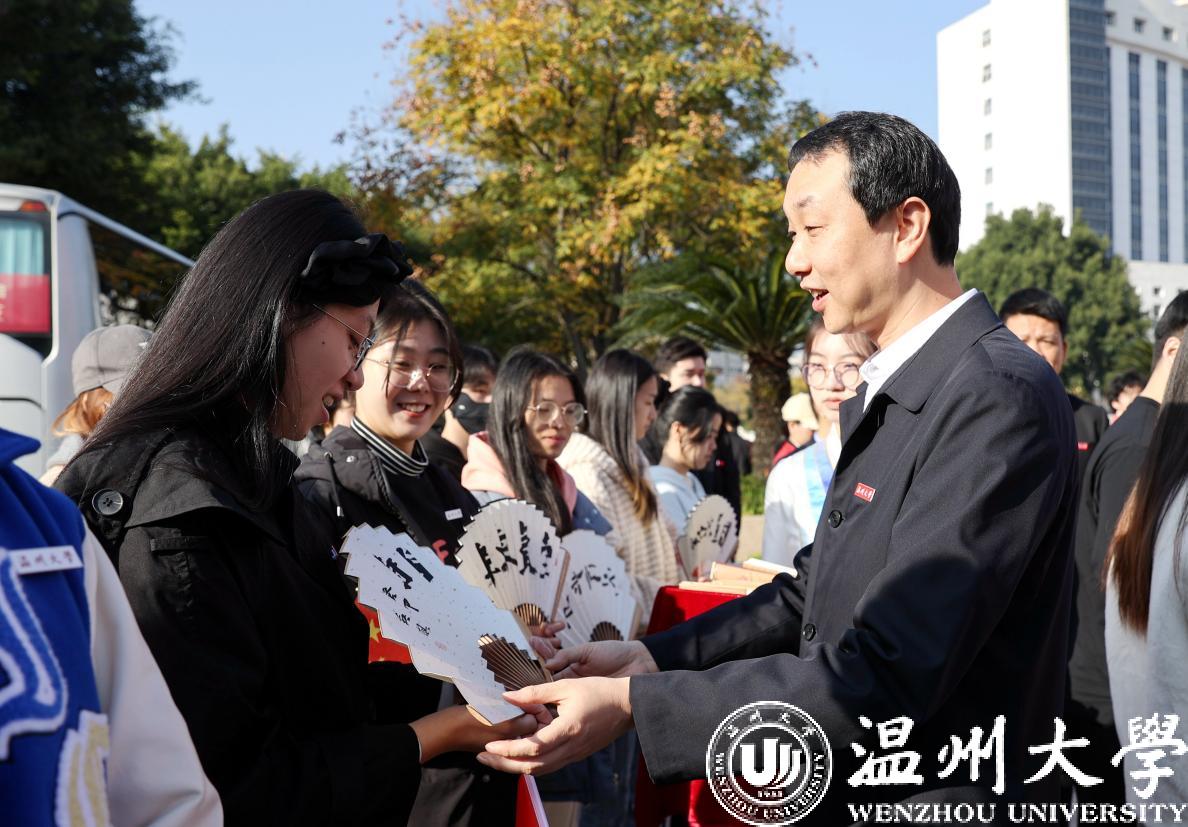 仪式前,张健亲切慰问了师生演职人员,并为他们送上一份“特殊”的礼物。礼物是由美术与设计学院书法专业师生精心为歌剧《五星红旗》创作的文化扇,他们将对《五星红旗》巡演的美好祝福寄托于走笔运墨所诞生的笔意情性中,这也是51暗网 艺术类课程思政化全方位融合的生动体现。